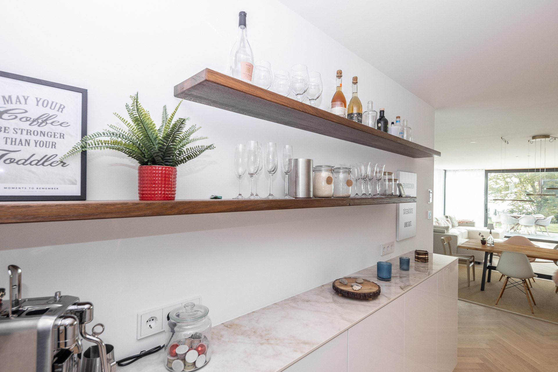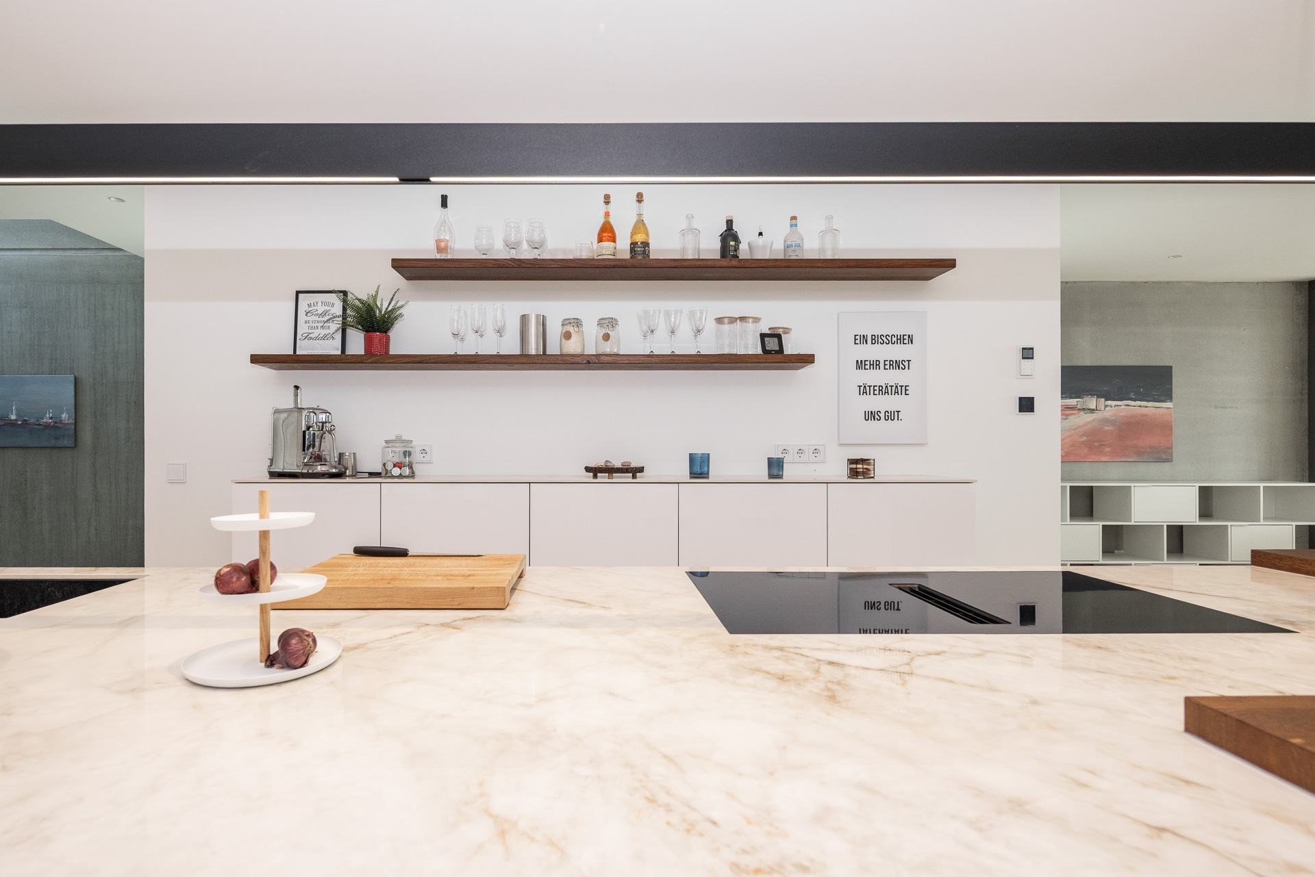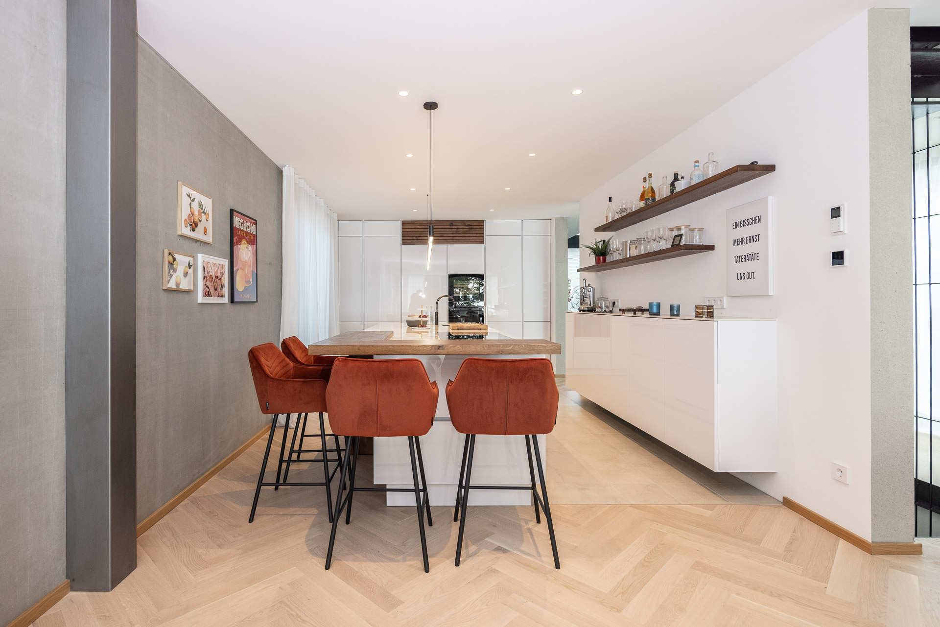 Aus unserer Schreinerei stammt das markante Holzelement: eine aus Eiche Massiv und farblich abgestimmte Theke über Eck auf Gehrung gearbeitet, sowie ein Massivholzeinsatz im Hochschrank. Über filigrane Lamellen kaschiert er elegant die Klimaanlage und sorgt gleichzeitig für ein ruhiges, gleichmäßiges Gesamtbild. Passend dazu wurden zwei massive Eichenholzregalbretter gefertigt, die dem Raum zusätzliche Wärme und Natürlichkeit verleihen.
