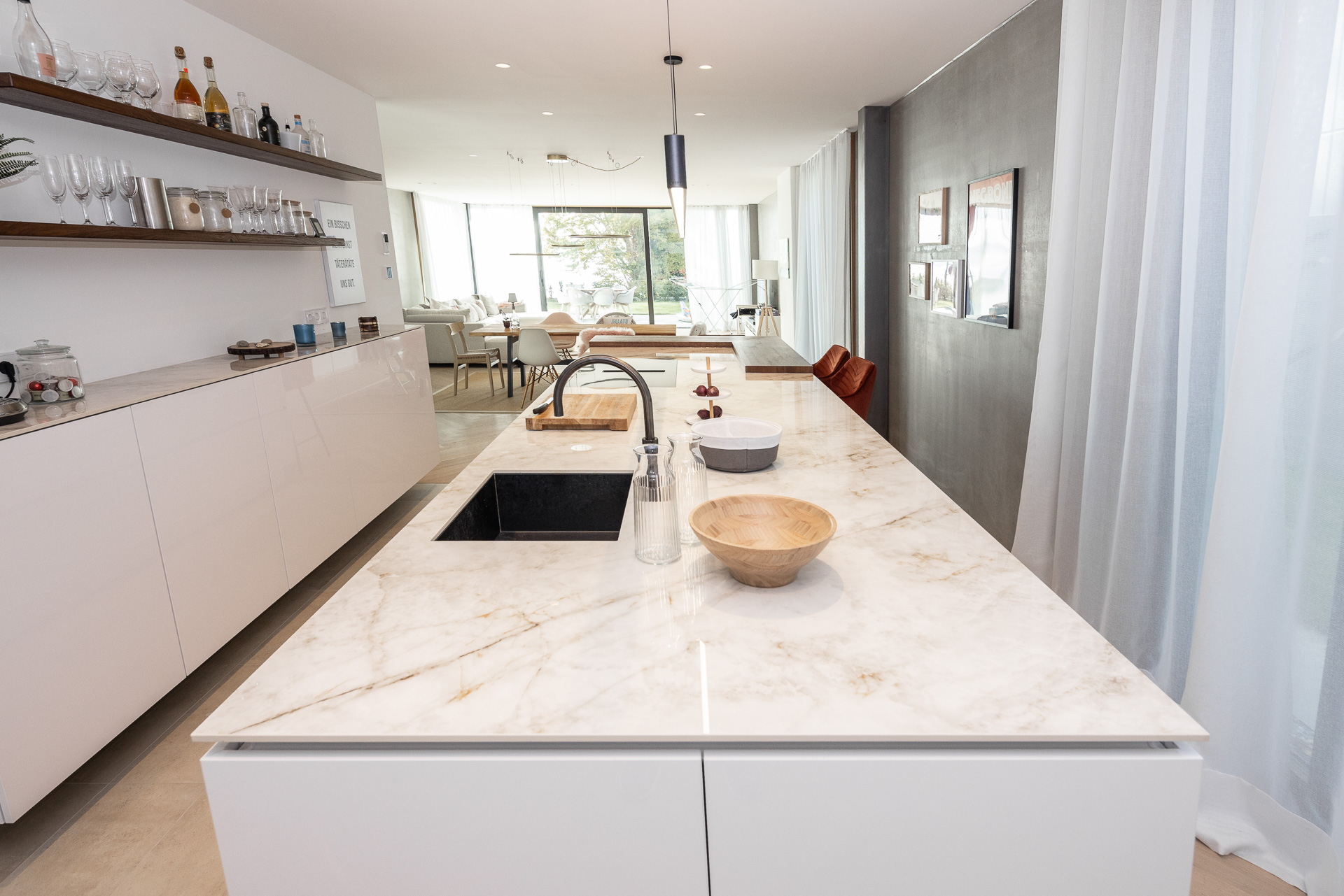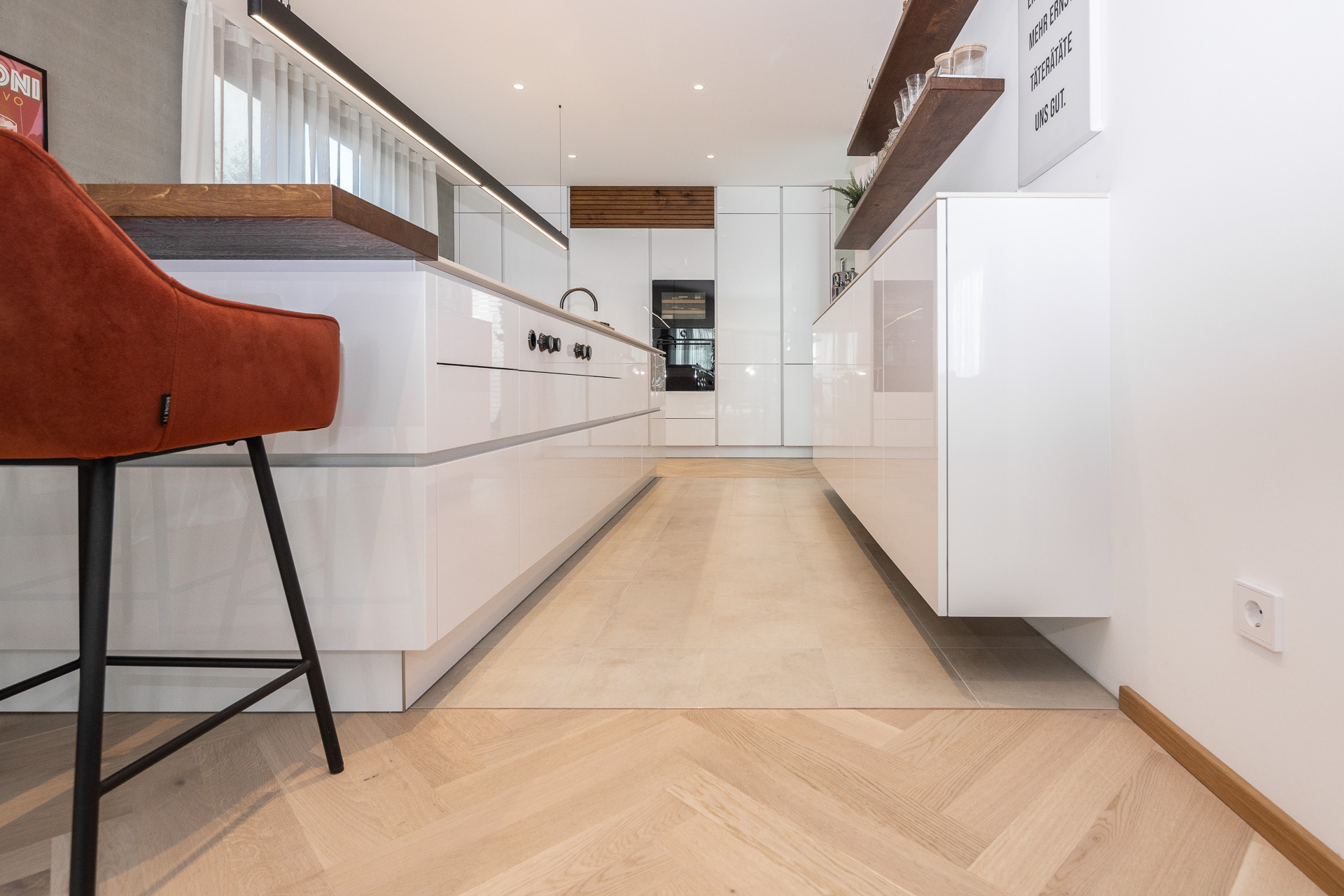 Die Küche beeindruckt bereits auf den ersten Blick durch ihre helle Hochglanzoberfläche, die den gesamten Raum großzügig und offen wirken lässt. Perfekt ergänzt wird das Erscheinungsbild durch die hochwertige, hochglänzende und marmorartig strukturierte Stein-Arbeitsplatte deren Adern warm und passend zum Holzton sind und die somit einen edlen Akzent setzt.