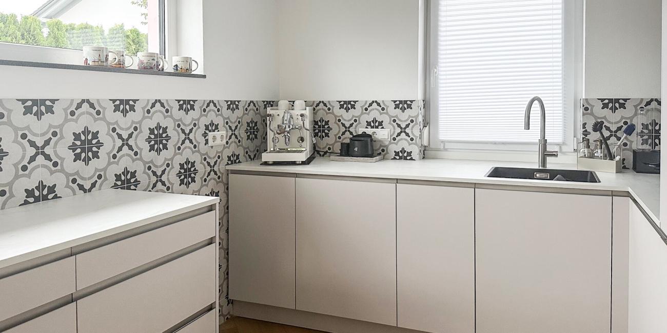 Diese helle, grifflose Küche besticht durch cremefarbene Fronten, welche perfekt mit der weiß marmorierten Steinarbeitsplatte harmonieren. Der Fuß der Kücheninsel ist ebenfalls mit einer Steinplatte verkleidet, was der Küche eine gewisse Eleganz verleiht. Besonderer Hinkucker in dieser Küche ist sicherlich neben der kunstvoll gefließten Rückwand der eingebaute Weinkühler.
